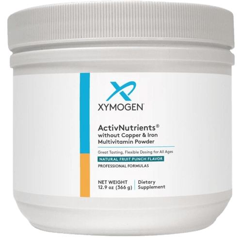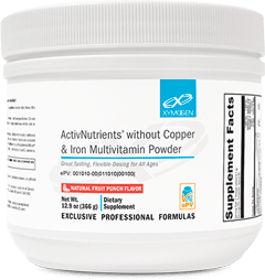 ActivNutrients® without Copper and Iron Multivitamin Powder is a high-quality, hypoallergenic multivitamin formula designed to help meet the daily nutritional needs of children and adults. The formula’s delicious, natural fruit punch flavor and its powdered form make it easy to use. It features natural and activated forms of vitamins, such as beta-carotene, cholecalciferol, folate as 5-MTHF (5-methyltetrahydrofolate), and B12 as methylcobalamin as well as patented Albion® chelated mineral complexes. The activated nutrient profile supports vitamin/mineral synergistic activity; antioxidant protection with vitamins C and E, selenium, and carotenoids; healthy immune activity; cellular metabolism; and detoxification.