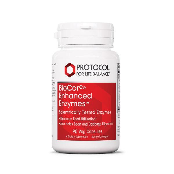Digestive enzymes are essential to the body’s absorption and full use of food. The capacity of the body to make enzymes diminishes with age in some individuals, and therefore the efficiency of digestion may decline. BioCore® Enhanced Enzymes™ offers a blend of fungal-derived enzymes that will aid in the digestion of most foods, including beans and cruciferous vegetables. The vegetarian enzymes in BioCore® Enhanced Enzymes™ have been tested in a controlled laboratory study using a digestive model for their activity throughout the entire pH range of the digestive system and have been shown not to be degraded by acid in the stomach.