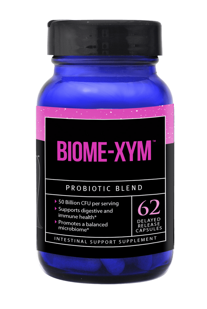 BIOME-XYM™ is a blend of twelve (12) broad spectrum super strains of probiotic bacteria that originate from five (5) different genera or families to promote maximum biodiversity throughout the G.I. tract. They are delivered to the lower intestinal tract via delayed release, acid-resistant capsules. Each dosage contains 50 billion CFU that exerts a powerful balancing effect on the body’s microbiome. Biome-xym™ contains LactoStim®, a patented prebiotic that re-hydrates and stimulates probiotic cells.