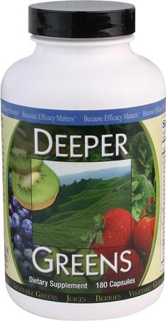 Deeper Greens provides beneficial nutrients from berries, fruits, vegetables and greens to support a healthy diet. This complete formula combines concentrated fruits and berries with a vegetable antioxidant blend to help build antioxidant reserves and protect the body from free radical damage. In addition, Deeper Greens includes a “superfood” blend containing additional phytonutrients and micronutrients to help boost energy levels. Deeper Greens comes in a gluten-free and dairy-free capsule form.
