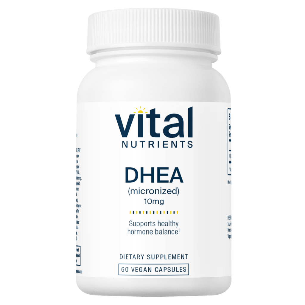 Levels of DHEA can decline with age as part of the natural aging process. DHEA is a hormone that is produced in our bodies by the adrenal glands and the levels of this hormone may begin to decline after the age of 30. Supplementing may help replenish what our bodies lose over time, to support healthy aging. DHEA is a precursor to androgens, and along with other adrenal hormones, supports fat, sugar and mineral metabolism, immune response, energy levels, and estrogen and testosterone levels. Vital Nutrients DHEA is micronized to help increase absorption in the body.