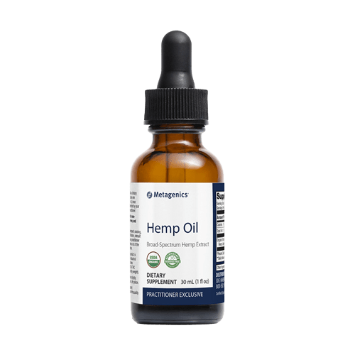 Metagenics Hemp Oil is an organic, broad-spectrum hemp extract sourced from aerial plant parts (stalk, stems, seeds, and flower) that consists of naturally occurring phytocannabinoids and terpenes, which have been shown to support body function and general health.