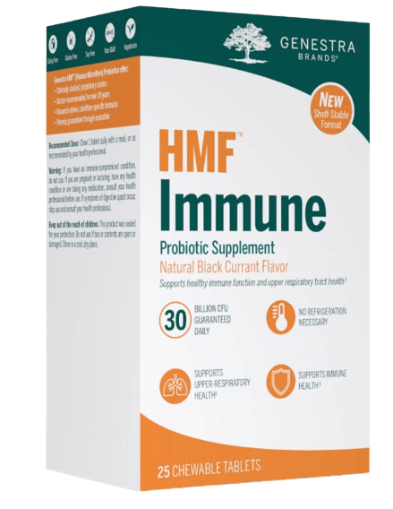 HMF™ Immune combines proprietary human-strain probiotics with vitamins C and D to provide targeted support for the immune system. Each convenient, once-daily chewable tablet provides a blend of five research-driven probiotic strains from both the Lactobacillus and Bifidobacterium genera. As nearly 80% of the body's immunologically active cells are located in gut-associated lymphoid tissue, an important connection has been demonstrated between the intestines and the immune system.