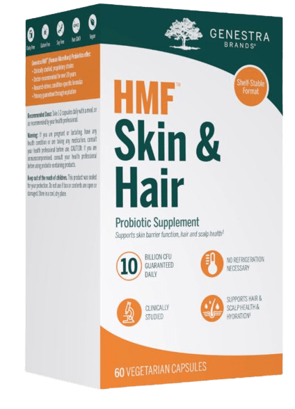 HMF Skin and Hair is a probiotic supplement designed to support skin barrier function, hair and scalp health. HMF™ Hair & Scalp probiotic provides 10 billion CFU of the clinically studied strain, Lactobacillus paracasei (ST11), which may support the health of the scalp microbiome and support skin barrier function. HMF™ Hair & Scalp is a dairy-free, soy-free, gluten-free, shelf-stable formula with no refrigeration necessary and guaranteed potency through expiration.