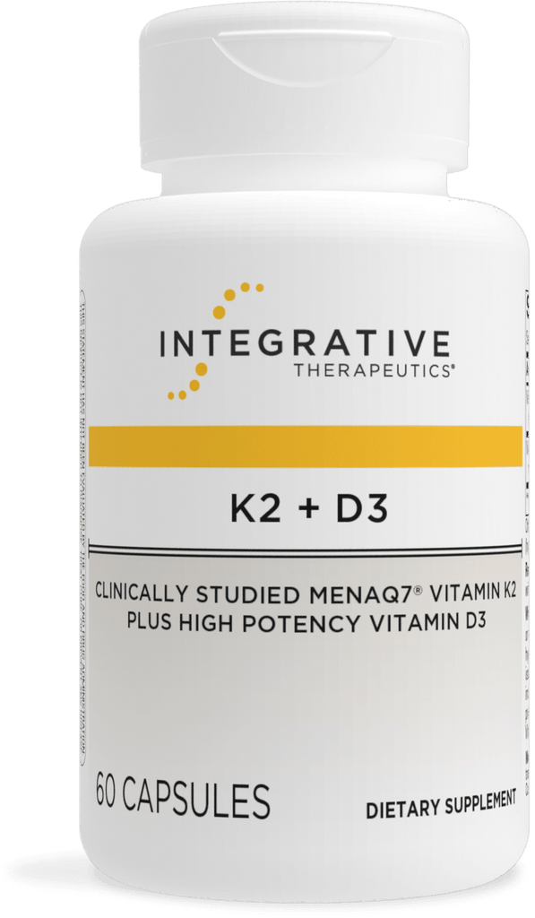 K2 + D3 provides cardiovascular and bone support with clinically studied MenaQ7® vitamin K2 plus high potency vitamin D3. The two vitamins complement one another to help the body absorb and use calcium for healthy bone support. Vitamin K2 helps transport calcium away from the blood vessels by decreasing levels of the inactive form of Matrix Gla-Proteins (MGPs). Active MGPs bind calcium in the blood and support healthy calcium deposition in bones. (MenaQ7® is a registered trademark of Lesaffre et Compagnie, France.)