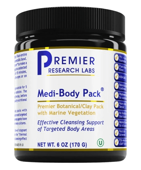 Medi-Body Pack® is a premier-quality, topical detox formula designed to help restore the bioenergetic flow of stagnant meridians, especially over areas impacted by historical trauma, interference fields, or lymphatic stagnation. It contains organic sea vegetation, mineral-rich bentonite clay, and targeted organic botanical agents, key cleansing ingredients used for centuries in many cultures.
