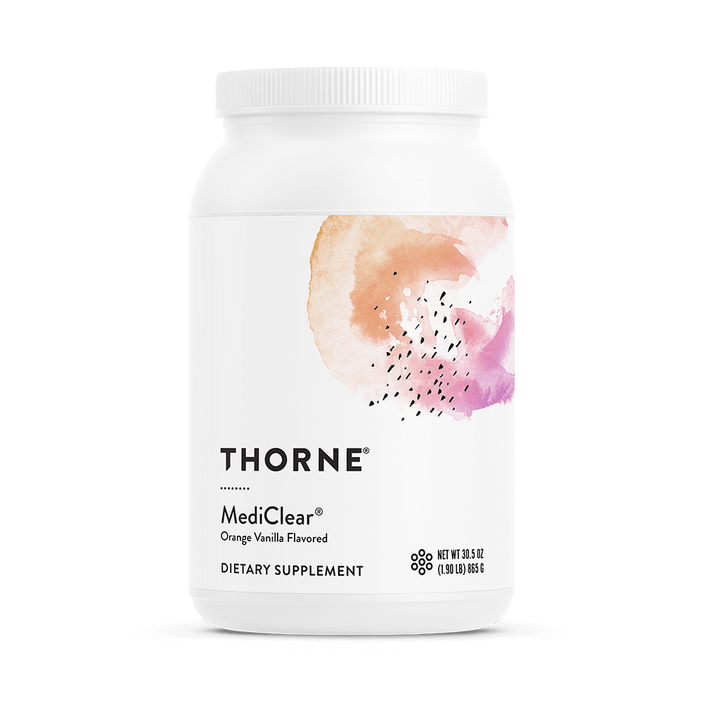 MediClear, a rice-and-pea-protein-based supplement with a complete multi-vitamin/mineral profile and additional GI and liver support nutrients, is the cornerstone of Thorne’s detox programs.*