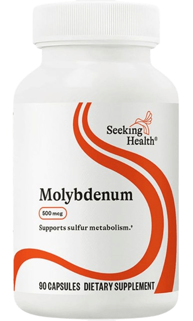 Molybdenum 500 by Seeking Health provides 500 mcg of molybdenum (as molybdenum glycinate chelate) in each easy-to-swallow vegetarian capsule. Molybdenum is an essential trace mineral. In the human body, molybdenum is found in the bones, liver, and kidneys. Molybdenum plays a role in a number of important biochemical processes, like waste processing in the kidneys, development of the nervous system, and the activation of enzymes that are involved in breaking down food to produce energy.