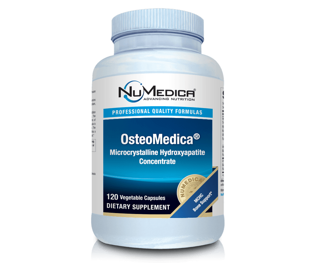 OsteoMedica® provides MCHC (microcrystalline hydroxyapatite concentrate) from New Zealand open-range, pasture-fed cattle raised in pesticide-free environments. Cold-processing technology preserves the delicate organic factors that heat and solvents destroy. The MCHC in this formula is a full-spectrum, highly absorbable crystalline compound composed of calcium, phosphorus, organic factors, collagen (type 1), and an active protein matrix, along with its naturally occurring bone growth factors. Thirty years of research has documented its benefit in optimal bone health. OsteoMedica® also contains magnesium and vitamin D3 to provide a comprehensive bone support formula. Vitamin D3 stimulates intestinal calcium absorption and helps regulate calcium and phosphorus homeostasis in the body.