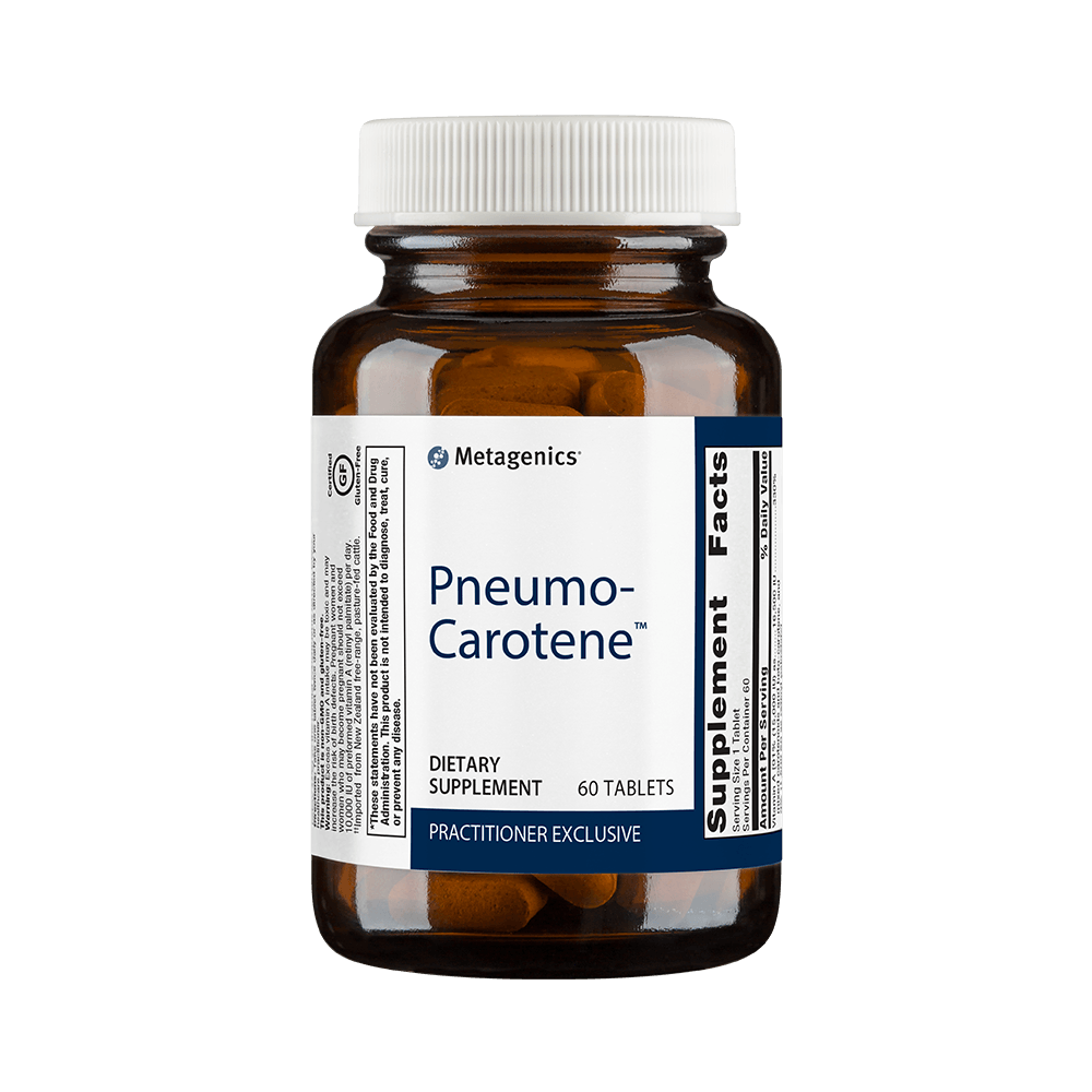 Pneumo-Carotene is a scientifically blended formulation featuring a broad spectrum of antioxidant nutrients—including vitamins C and E and Caro-xan, our proprietary blend of beta-carotene and Betatene mixed carotenoids—for balanced antioxidant protection to support lung tissue health. The bovine lung concentrate is guaranteed raw (processed below 37°C) so the natural constituents remain intact.