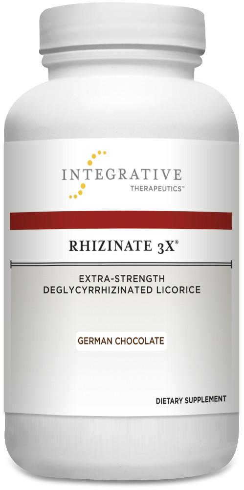 Rhizinate® 3X is triple strength deglycyrrhizinated licorice (DGL) in a great-tasting German chocolate-flavored chewable tablet for fast, soothing, digestive relief. DGL has been shown to support the mucosal lining of the stomach and intestines.