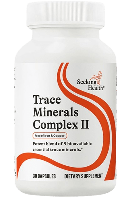 Trace Minerals Complex II by Seeking Health provides 9 essential trace minerals needed for optimal health in well-tolerated and bioavailable forms, plus silica from horsetail. Trace Minerals Complex II is formulated without both iron and copper. Trace minerals, or “microminerals,” are important nutrients that the body needs in small amounts to maintain proper function. Typically taken up from the soil by plants, trace minerals may be lacking in the modern diet due to decreasing nutrient content in the soils used in commercial farming. Trace Minerals Complex II provides Albion chelated trace minerals.