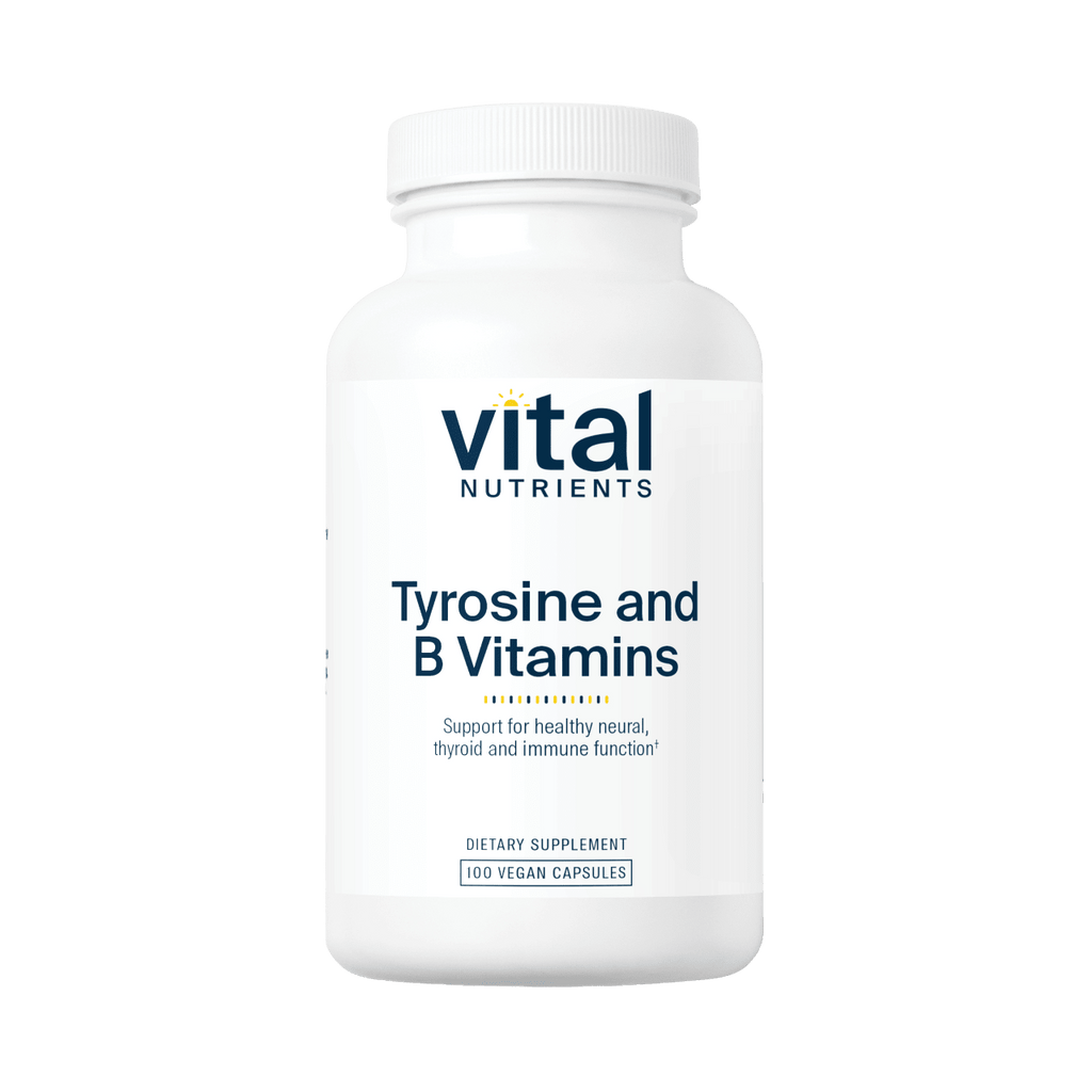 Tyrosine and B-Vitamins may help support healthy adrenal and thyroid function. The amino acid tyrosine affects neurotransmitters and may promote healthy emotional well-being, as well as supporting alertness, memory and focus in stressful situations. This combination formula helps build and support dopamine, epinephrine, norepinephrine, and thyroid hormones. It also supports the body's immune system.