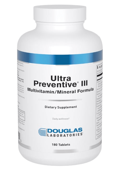 Ultra Preventive® III by Douglas Laboratories provides a comprehensive vitamin/mineral/trace element formula with bioavailable nutrient forms to support optimal health and wellness. This formula features Vitamin K2 for bone and vascular health; three forms of vitamin B12 for mitochondrial energy and methylation support; Metafolin® L-5-MTHF folate and choline for the homocysteine-methionine cycle; and antioxidants for immune and cellular health.