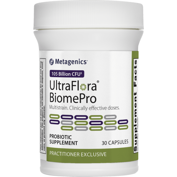 UltraFlora® BiomePro Probiotic is a high-potency, multi-strain probiotic that supports digestive, immune, and respiratory health in one daily capsule. The gut plays an essential role in immune function—but stress, poor diet, and other lifestyle factors can throw off the balance of good and bad bacteria. BiomePro delivers a blend of eight clinically studied probiotic strains to help restore microbial balance and promote whole-body wellness. Each capsule contains 105 billion CFU (colony-forming units), guaranteed through the end of expiration, and comes in a shelf-stable, no-refrigeration-needed format for easy daily use.